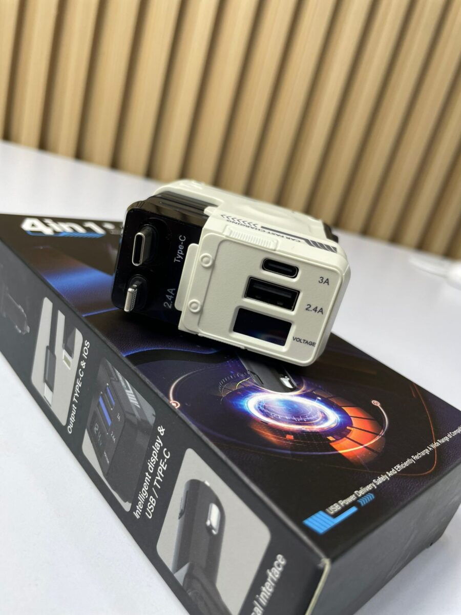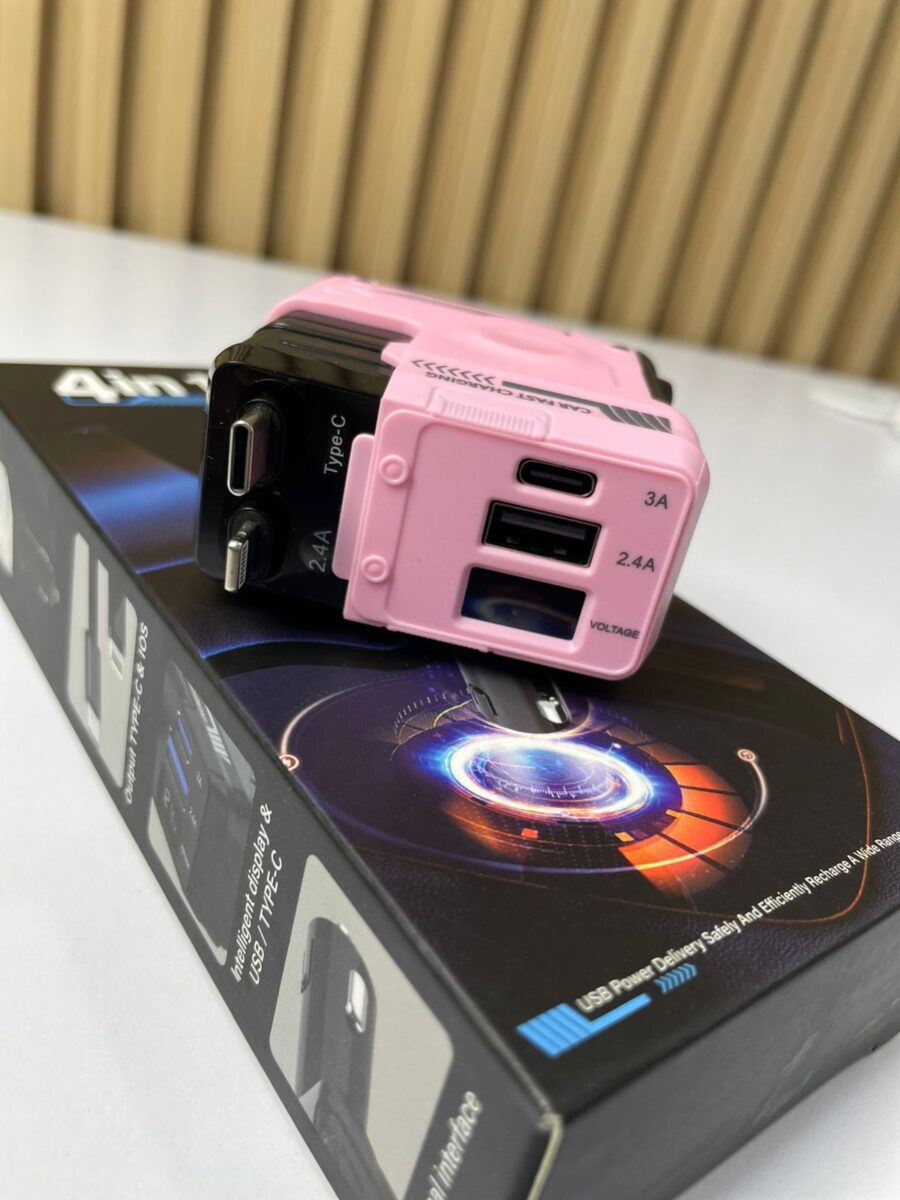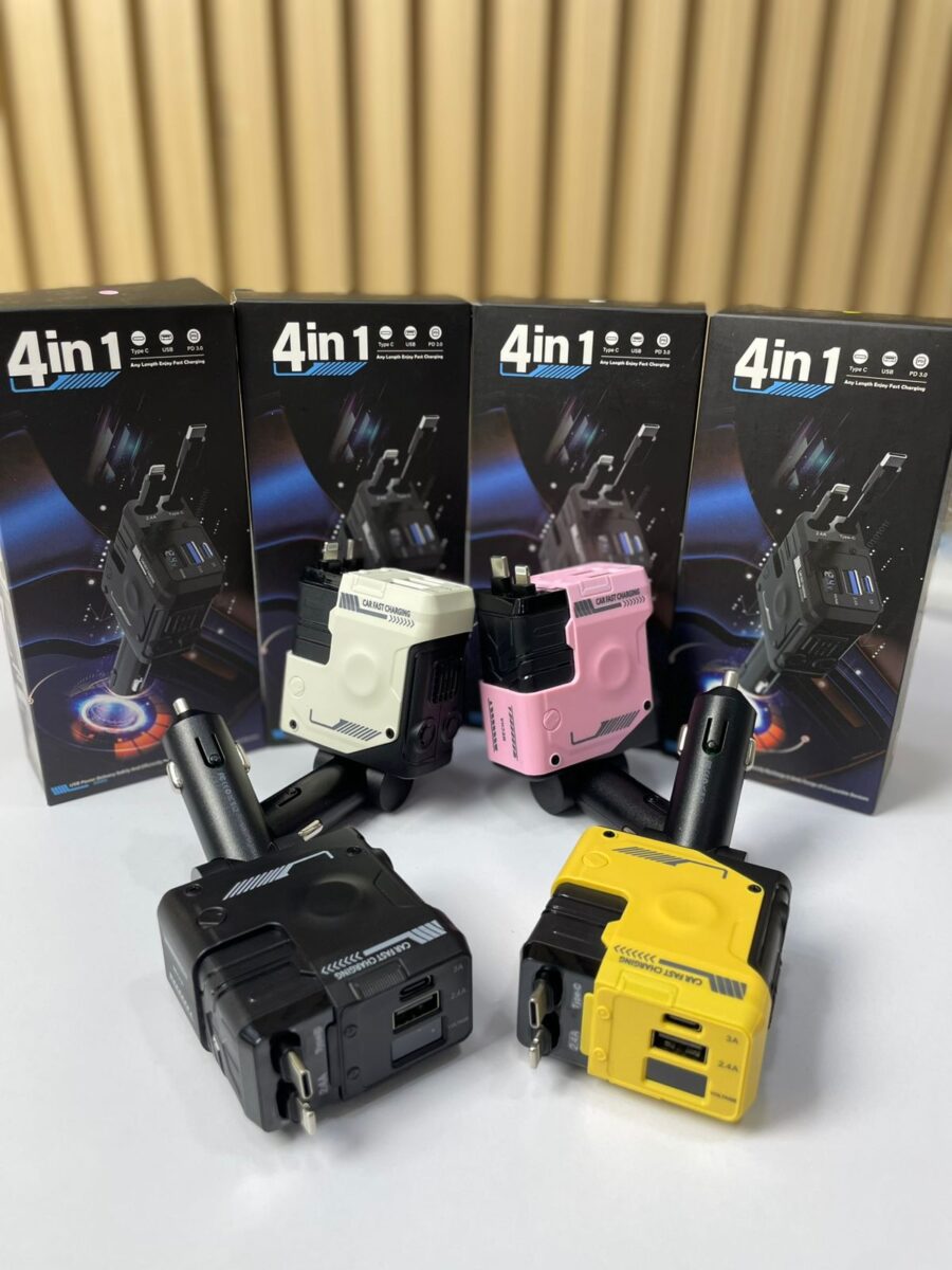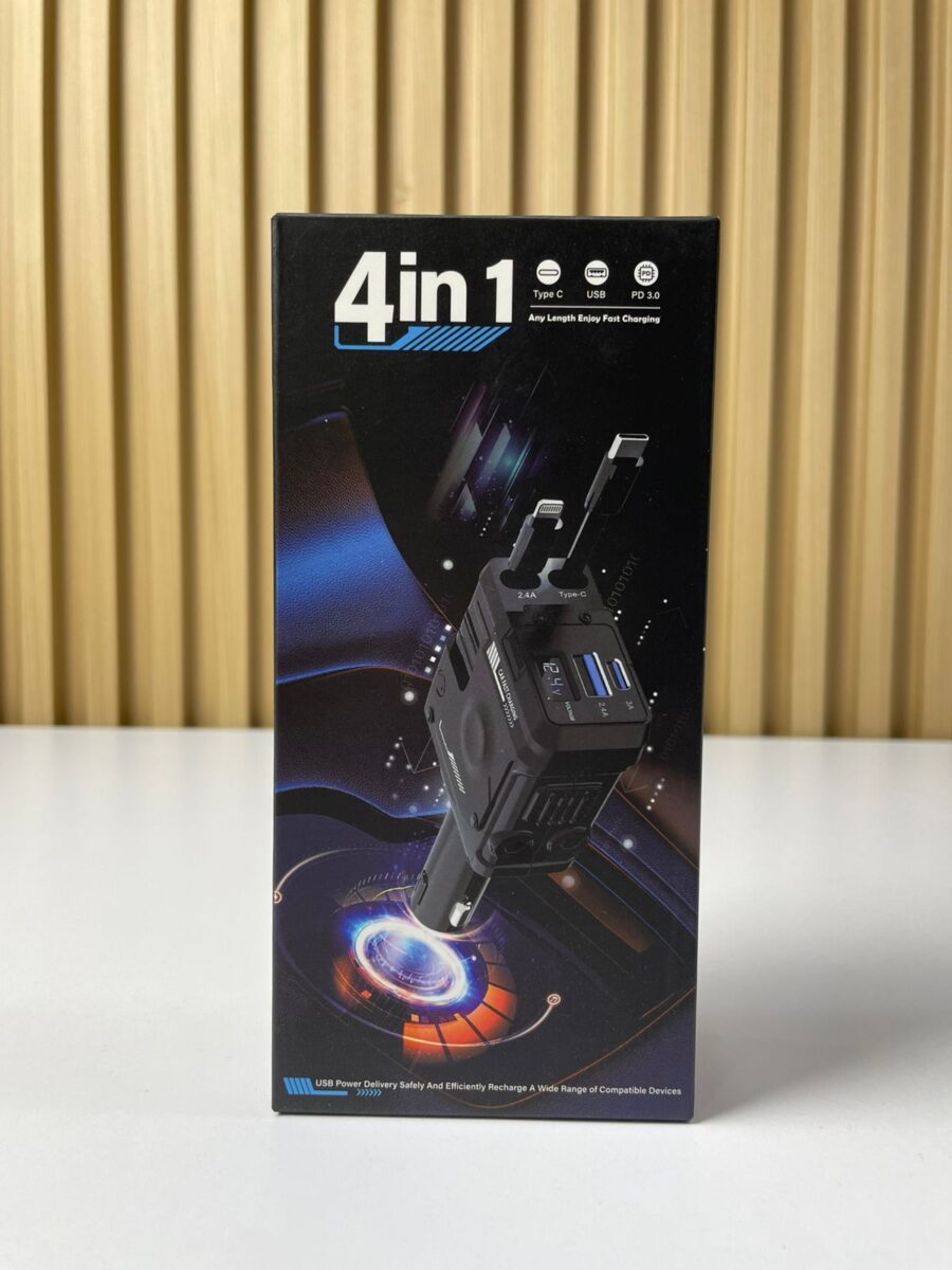 El Cargador de Carro 4 en 1 es un dispositivo multifuncional diseñado para mantener todos tus equipos cargados mientras viajas. Cuenta con puertos USB y Type-C de carga rápida, además de un cable retráctil con conectores intercambiables que incluyen Lightning, USB-C y Micro USB. Ideal para cargar varios dispositivos al mismo tiempo con máxima eficiencia y seguridad.